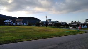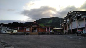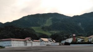 夕暮れ時の施設の写真です。バックにある斜面がスキー場です。六月とあって、ゴンドラも運航されておらず、下からしか眺められませんでした。