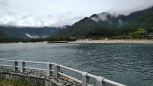 作中で表と呼ばれる五木村(五木村は小説用の地名で、現地名は違います)の海水浴場となっている砂浜です。お盆休み時の写真ですが、台風接近のため天候が悪く、訪れている人は少ないです。