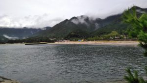 作中で表と呼ばれる五木村(五木村は小説用の地名で、現地名は違います)の海水浴場となっている砂浜です。お盆休み時の写真ですが、台風接近のため天候が悪く、訪れている人は少ないです。